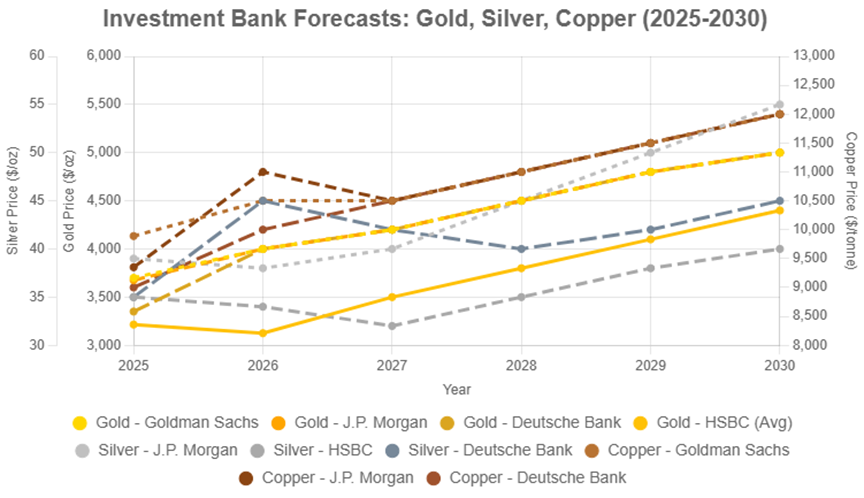 • 資源與消費的回暖:資源板塊穩健,貴金屬與電動車板塊上漲,我們堅信黃金會持續上漲(年漲25%)。白銀正在追趕,人工智慧、太陽能需求推動了其上揚。銅資源的需求如火,因人工智慧發展而帶動電廠需求將高達42萬噸(現價4.6美元/磅,2030年價格達6美元/磅)。電動車補貼讓消費板塊重獲活力。巴克萊指出,關稅雖壓進口,但資源供應鏈將更堅韌。