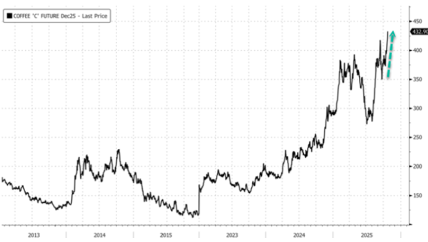全球最大的咖啡生產國巴西因嚴重乾旱和極端高溫等緣故,咖啡豆出現供應危機,將阿拉比卡咖啡期(KC)價格推動到每磅4.36美金,加上主要進口港庫存僅能維持數週的供應量,預示著全球供應面臨巨大缺口,供應復甦預計至少要等2029年。咖啡的成癮性造就了顧客高度黏性,需求量難以大幅縮減。這也變相利好中國國內及雲南咖啡種植產業相關等產業,依2024年上半年出口量約3.33萬噸,出口額約1.32億美元,其中咖啡生豆佔71.28%的出口量及70.12%的出口額。主要出口市場為德國,荷蘭,越南。具備咖啡產業鏈完善等前端咖啡銷售產業會因咖啡豆業務佔比的大小而決定最後淨利多少。如偏向週期性投資風格的中線投資者,可適度配置相關概念股。