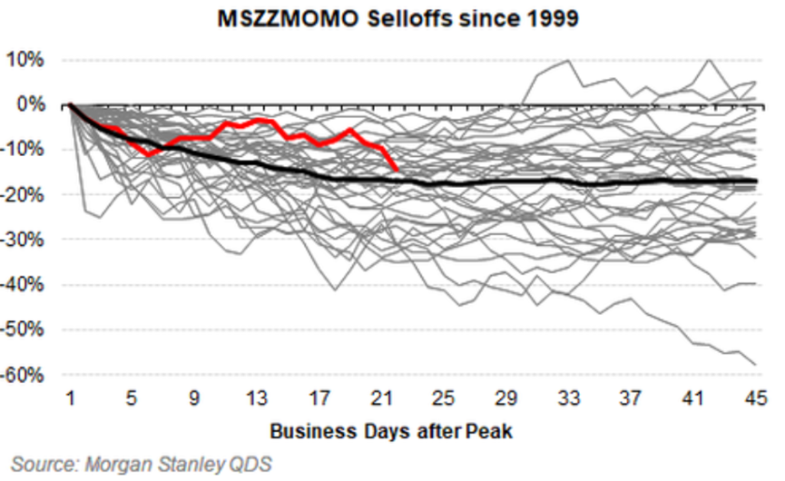 摩根士丹利量化策略團隊在報告中指出,目前動量股拋售的深度與歷史模式相當相似。自高點以來,動量股多頭組合已下跌19%,與此類拋售潮中平均下跌22%的歷史水準一致。只從數據觀測拋售行情處於“後半段”,但並不意味著結束,動量股中β係數(科技股、生物科技股和加密貨幣相關股等)較高的部分可能會面臨更多的下跌空間。符合此類資料的有特斯拉(TSLA.US),英偉達(NVDA.US),META(META.US),Coinbase(COIN.US),Moderna(MRNA.US)等知名公司,這也是各大行開始做空或看跌這類公司的主因。投資者適合避免去購買或減持此類公司的持倉佔比較為符合現有的環境。