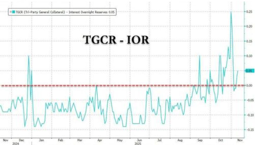 美國市場流動性指標出現“縮緊苗頭”,關鍵利率指標的回升,正加劇市場關於美聯儲將被迫重新擴張其資產負債表的猜測,這一舉措被部分市場人解讀為新一輪的“量化寬鬆”(QE)。不只是SOFR(有擔保隔夜融資利率),三方回購率(Tri-Party Repo)近期也反彈至準備金利率上方約0.8個基點。這意味著銀行準備金已經脫離「充裕」水平,開始進入「稀缺」區間。如果美股想繼續上漲維持強勢,就需要寬鬆貨幣政策刺激。若未出現相關訊號號,並不適合短期入場進行配置。