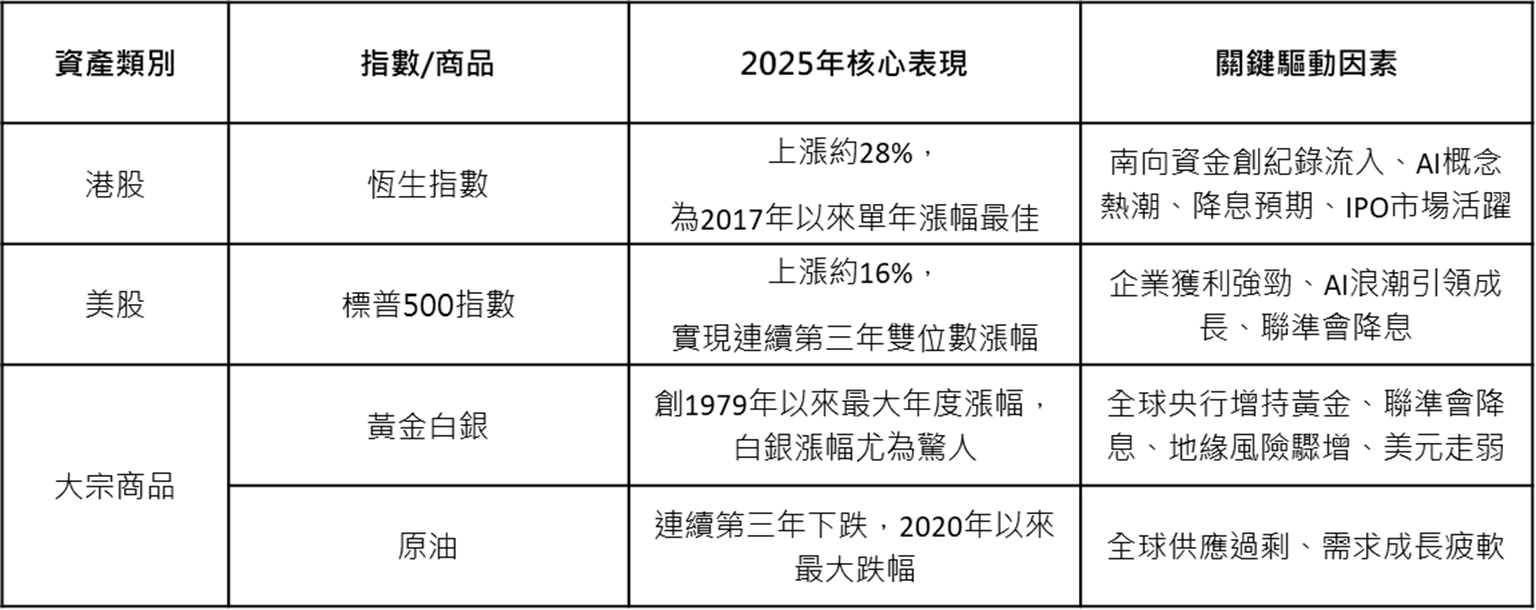 整體而言,2025年的全球資產表現個別發展,大致總結為「科技牛」、「金屬狂」和「美元頹」。港股與美股均從各自的驅動邏輯中實現上漲,而大宗商品的「冰火兩重天」則凸顯了經濟轉型 、宏觀政策和供需基本面的深刻影響。