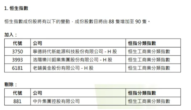 恆生指數公司宣布,恆生指數成分股由88只增加至90隻。新加入寧德時代(3750.HK),洛陽鉬業(3993.HK),老鋪黃金(6181.HK),剔除中升集團控股有限公司(881.HK)。所有變動將於2026年3月6日(週五)收市後實施並於2026年3月9日(週一)起生效。