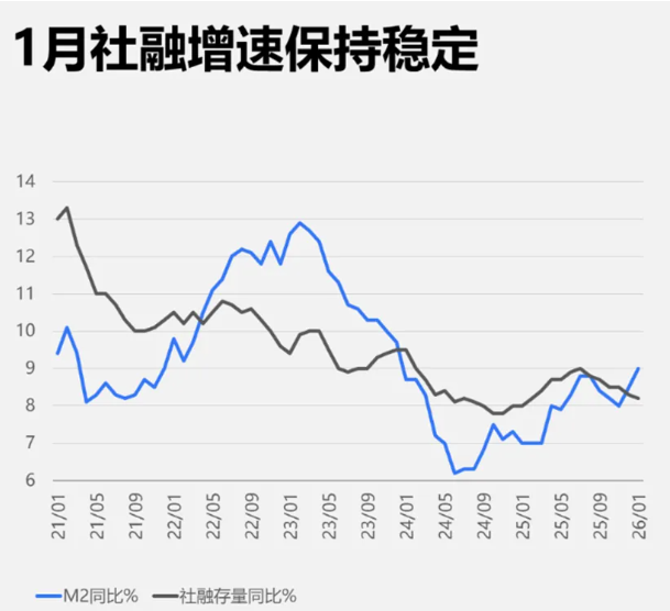 信貸的開門紅對於二級市場會是個利好消息,並且按照現在廣義貨幣增長速度以及內地的貨幣方向會偏向於維持廣義貨幣增速機會偏大。簡單來說內地銀行長期存款下降到1%以下並維持較長時間可能性較高,香港內地市場上漲趨勢帶動實體經濟會成為2026年的主要方向。同時要注意的是M2貨幣成長過快同樣會容易將二級市與實體經濟泡沫化變得嚴重,定期存款愛好者的財富也會流向借貸投資者。 M2成長趨勢不變的情況下,時間越是接近2026年末,風險累積越高,資產的防守性配置也理應增大。