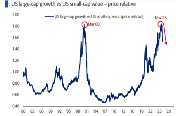 上圖顯示的是美國大盤成長股與美國小型價值股的相對價格。