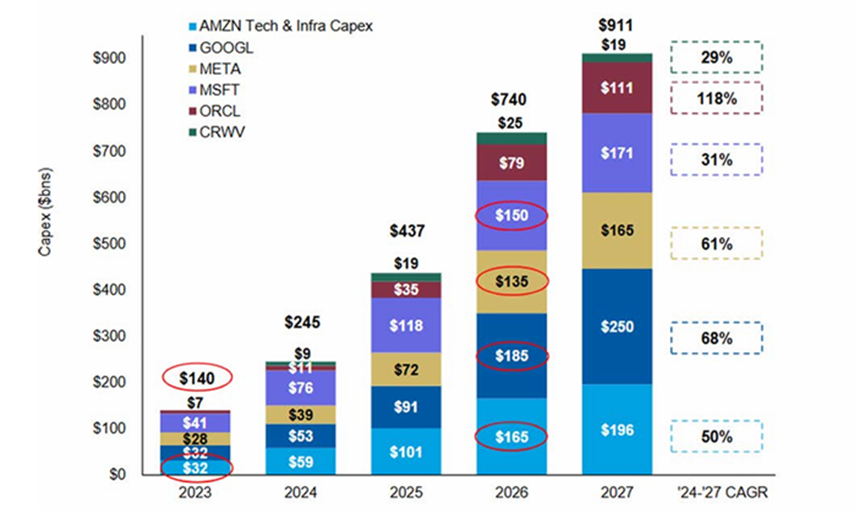 註: Tech & Infra Capex: 支撐基礎設施的資本支出; AMZN: 亞馬遜; GOOGL: Google; META: Meta公司; MSFT: 微軟; ORCL: 甲骨文; CRWV: CoreWeave