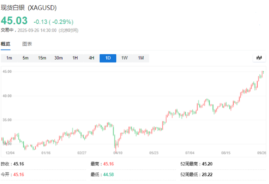截至9月26日,白銀價格大幅上漲,突破45美元,創下十四年來的新高。在早期數月之前的每週策略重複提醒投資者佈置的追蹤白銀價格ETF,會大概率維持震盪上漲,強勢攀升超越黃金的漲幅。從原先的工業復甦概念擴增至資料庫搭建數量大幅增加的利多前景。依照美國甲骨文(ORCL.US)公佈的超市場預期訂單資料來看,資料庫建置是目前環球步入科技之路國家們的剛需。資料庫運作以及資料傳輸的電纜用到大量的金銀銅,盡量不要被股票市場的上漲而忽略了貴金屬商品的價值。