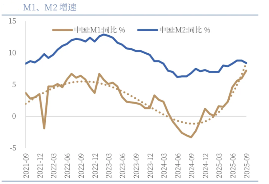 M1貨幣維持上行,本月增速超出市場預期,M2增速回落。雖然本月的金融數據表面顯示居民存款搬家去非銀行的行為暫停,但由於去年9月快速搬家的基數擾動,銀行存款資金去非銀行流向並不是真正的停止。市場從銀行到非銀(創投類)流向,刺激黃金(內地),企業債劵以及政府債劵。第四季實際利率目前仍處於較高水平,預計將實施10-20BP的降息政策調控。宏觀層面看二級市場還具備上漲的持續性,並沒有長期封頂的跡象。