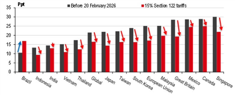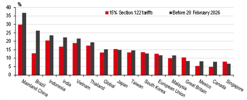 同時,特朗普政府轉向第122條關稅,為那些透過巨額投資承諾與美國達成關稅「協議」的亞洲經濟體帶來棘手問題。如果新的第122條關稅最終高於去年的談判對等稅率,這些經濟體還會堅持協議嗎?這並非空談擔憂,包括新加坡、日本和韓國在內的許多已開發經濟體現在面臨更高的美國關稅前景(見圖2)。